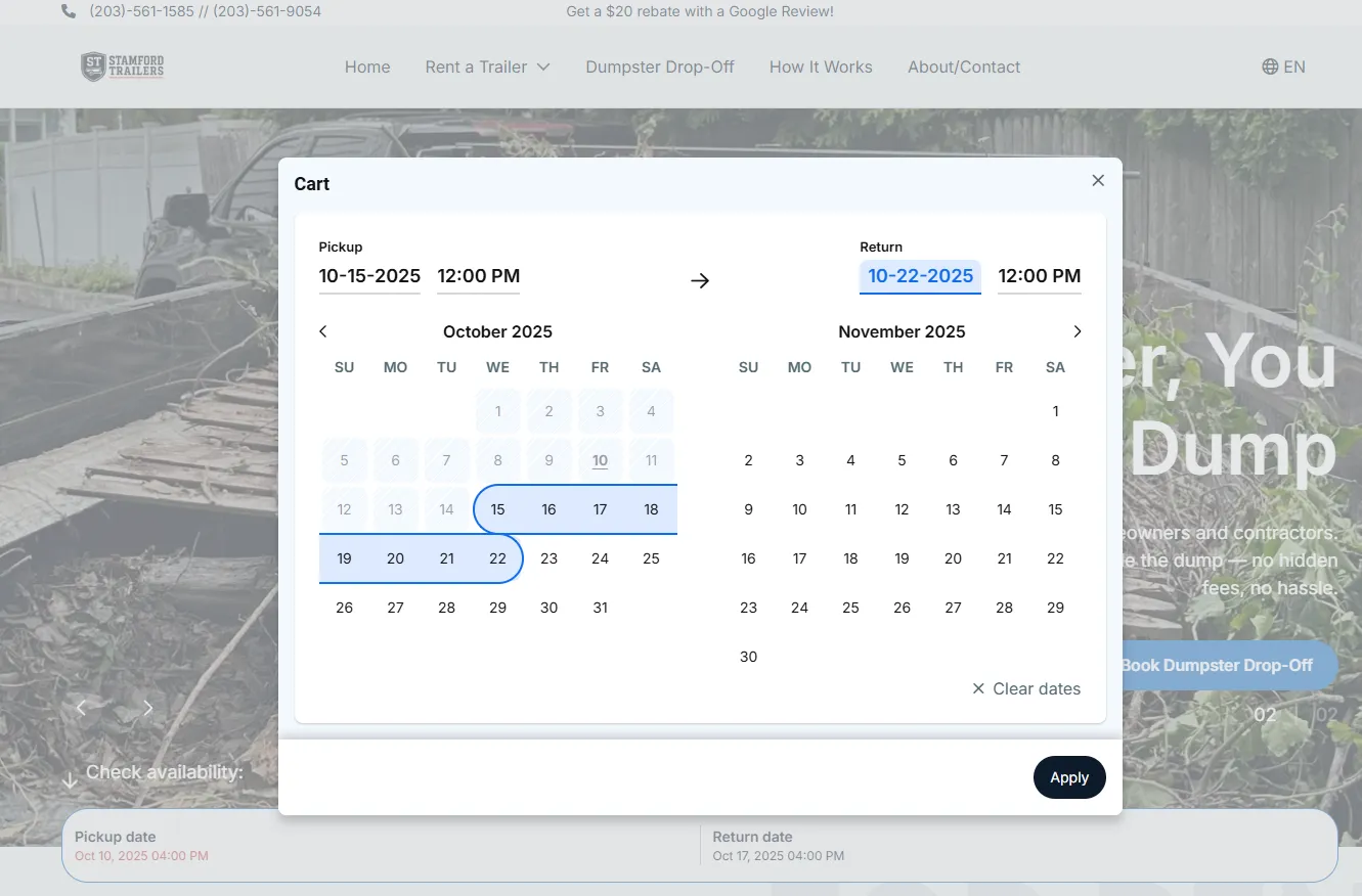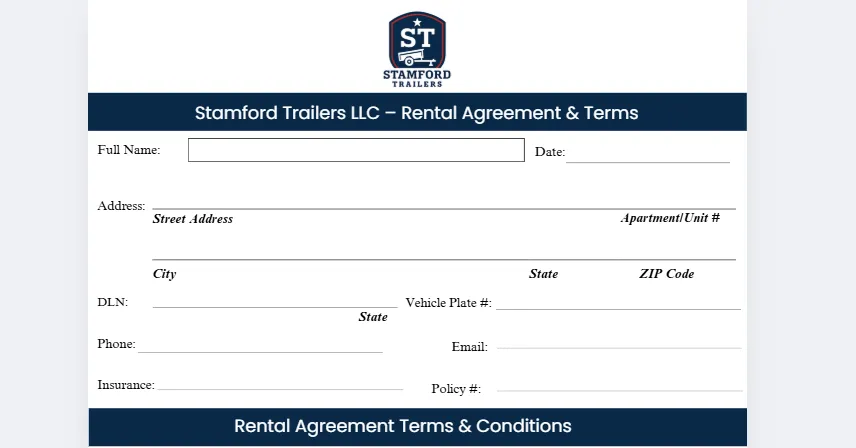 Bring your driver’s license and make sure your vehicle is equipped for towing (2-5/16″ hitch, 7-pin plug, and brake controller).